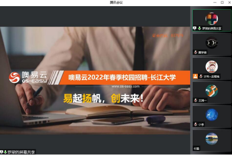 线上宣讲会邀请校企合作企业15家,分为3个场次进行,每场宣讲会有5家企业宣讲,每家企业宣讲时长30分钟以内,共计150分钟。线上宣讲会在进行企业推介的同时,向22届毕业生提供前、后端开发、软件测试、软件实施、技术支持、硬件工程师等岗位的就业机会。宣讲会现场氛围热烈,每场参与人数达到70余人,员工积极与企业互动提出应届毕业生初次就业关心的问题,并得到企业详尽的回复。计算机科学公司党委副书记颜学俊、就业辅导员余珺瑞参加“线上宣讲会”活动。颜书记对到场的企业表示欢迎,期待企业能收获满满,并对22届毕业生提出“先就业,再择业”的就业理念,希望同学们都能用好应届生身份,在毕业前找到一份较为满意的工作。