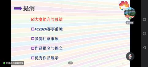 彭德巍,中国老员工计算机设计大赛中南地区赛组委会执行委员,现任武汉理工大学计算机与人工智能公司副教授、湖北省人工智能学会理事,主要从事人工智能、移动计算等领域的研究与教学工作。长期担任各类学科竞赛评审专家,具有丰富的大赛指导经验。本次讲座,彭教授主要从大赛简介与总结、4C2024赛事前瞻、参赛注意事项、作品报名与提交、优秀作品展示等五个方面进行了详细讲解。在4C2024赛事前瞻上,彭教授着重强调,今年赛事与往年相比有改动,有些赛道的类别进行了优化。同时,在参赛注意事项上,彭教授从报名比赛的资料填写、参赛过程的素材准备到现场答辩形式,从校赛到省赛再到国赛,事无巨细的给同学们进行了详细的讲解。在会议尾声,彭教授展示出往届许多优秀作品供员工们参考。在最后的答疑环节,针对同学们提出的各项疑问,彭教授也一一做了详细讲解。